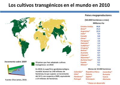 Por primera vez, en 2010, los diez países con mayor superficie de cultivos transgénicos superaron el millón de hectáreas, lo que proporciona una base amplia y estable para el crecimiento futuro. De acuerdo a esta superficie, se incluyen: EE. UU. (66,8 millones), Brasil (25,4 millones), Argentina (22,9 millones), India (9,4 millones), Canadá (8,8 millones), China (3,5 millones), Paraguay (2,6 millones), Pakistán (2,4 millones), Sudáfrica (2,2 millones) y Uruguay (1,1 millones).