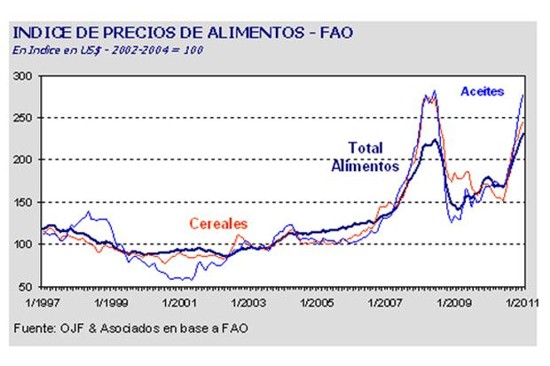Ahora nos referiremos sólo a los incrementos de valor de los alimentos. Este incremento es el que más reacciones ha traído, especialmente en aquellos países que importan comida. Se considera que este incremento es el detonante principal de las reacciones sociales que ha afectado inclusive a regímenes férreos que gobernaron sus países de forma muy dura durante varias décadas y que no habían sufrido reacciones sociales significativas, a pesar de que eran iguales que hoy en su estilo de gobierno. La causa pues de estas reacciones es, aunque no la única, el aumento internacional del precio de los alimentos.