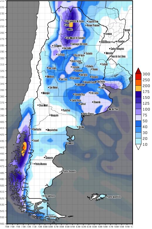 El domingo, el sistema frontal seguirá avanzando hacia el norte del país, permitiendo que toda la zona central, región pampeana y la Patagonia, se vea influenciada por el ingreso de un anticiclón que favorece a la estabilización de las condiciones, con un importante descenso de los registros térmicos. Las precipitaciones más importantes, se concentrarán en toda la franja norte del territorio nacional. Las mismas serán en forma de chaparrones y tormentas, algunas de las cuales puede ser fuerte, afectando especialmente a Salta y Jujuy, pero también se presentarán fuertes las que se registren sobre el norte de Santiago del Estero, Tucumán, Formosa, Chaco, Santa Fe, Entre Ríos, Corrientes y en menor medida, la provincia de Misiones.