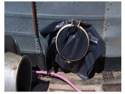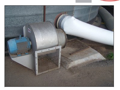 Conexión del conducto a la entrada del silo. Se retiraron los dos ventiladores para insuflar el aire frío a través de las dos bocas de aireación