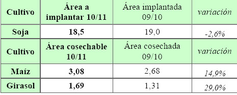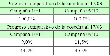 Al 17 de marzo, según el Panorama Agrícola Semanal la cosecha de maíz registra un avance del 9% sobre las 3,15 millones de hectáreas sembradas. Con respecto al girasol, se ha cosechado el 44,3% de las 1,69 millones de hectáreas estimadas cosechables.