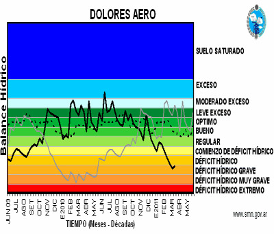 En la zona de Dolores, las últimas precipitaciones registradas han estado dentro de los valores normales y fueron superiores a la evapotranspiración, produciendo un leve humedecimiento de los suelos, pero las condiciones hídricas siguen siendo deficitarias.