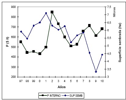 En el gráfico 1 se muestra la evolución, durante los últimos años, del precio interno promedio anual (en $ constantes de Marzo 2011 por tonelada) y la superficie sembrada a nivel nacional.