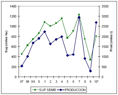 El gráfico muestra dos máximos marcados en los precios reales del cereal, en 2002 y 2008, el primero causado por la devaluación competitiva de comienzos del 2002 y el segundo que correspondió a la mejora en los precios internacionales desde el 2007. Posteriormente la crisis económica internacional bajó la demanda y, consiguientemente los precios de los commodities, esta situación tiende a revertirse a partir del último ciclo en 2010/11. A nivel nacional esta situación económica se vió acompañada en las campañas ’08/9 Y ‘09/10 por sequía que ocasionó la caida en la superficie sembrada en dichos ciclos. Con posterioridad, en el último ciclo se revirtió parcialmente la tendencia decreciente debido a mejoras en la condición climática del cultivo.