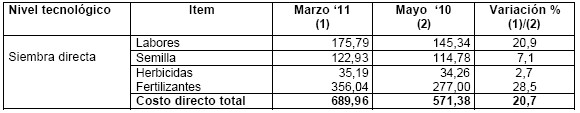 En el cuadro 2 se presentan las variaciones en los componentes del costo directo del cultivo según manejo entre la campaña anterior (valuados en mayo de 2010) y los vigentes en marzo 2011.