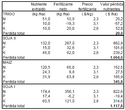 Operativo) como indicador financiero la soja de primera mantiene una alta competitividad ya que presenta un indice de 4,5 mientras que en el doble cultivo es 2,6 y similarmente en maíz 2,5. Cabe completar el análisis considerando, en una visión de mediano plazo, los aportes agronómicos de los cereales y el valor económico de la pérdida neta de nutrientes (IPNI, 2011), por ello se elaboró el cuadro 6 que muestra la perdida neta (descontando los aportes de nutrientes por fertilizantes en el manejo modal).