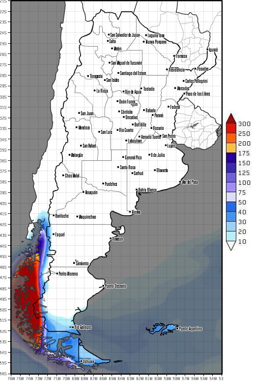 El domingo 8, una perturbación situada sobre el océano Atlántico, cerca de las costas de la Patagonia, puede generar algunas precipitaciones aisladas sobre la zona costera de las provincias de Santa Cruz, Chubut, Río Negro y puede extenderse hasta el sur de la provincia de Buenos Aires. De todas maneras, las precipitaciones que podrían llegar a desarrollarse serían muy débiles y en forma aislada.