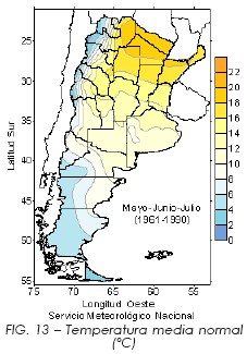 La Figura 13 presenta los valores normales del trimestre mayo-junio-julio para la temperatura medía, correspondiente al período 1961-1990. Allí se observan temperaturas mayores a 16ºC en el norte del país, cercanas a 12ºC en el centro, e inferiores a 6ºC en el sur y oeste de la Patagonia.