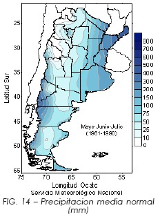 En la Figura 14 se muestran los valores normales de precipitación para el trimestre mayo-junio-julio, correspondiente al período 1961-1990. Se observan valores superiores a 400 mm en Misiones y noroeste de la Patagonia, valores cercanos a 150 mm en gran parte de la Pampa Húmeda y oeste de la Patagonia y valores inferiores a 10 mm en la región pre-andina del norte.