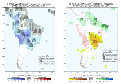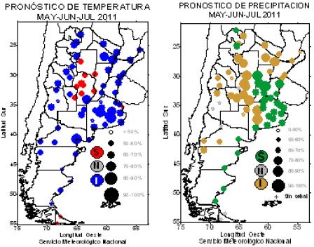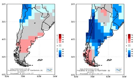 Las Figura 14 y 15 nos muestran el comportamiento regional previsto para el trimestre mayo-julio de 2011 de las temperaturas medias y precipitaciones, respectivamente: