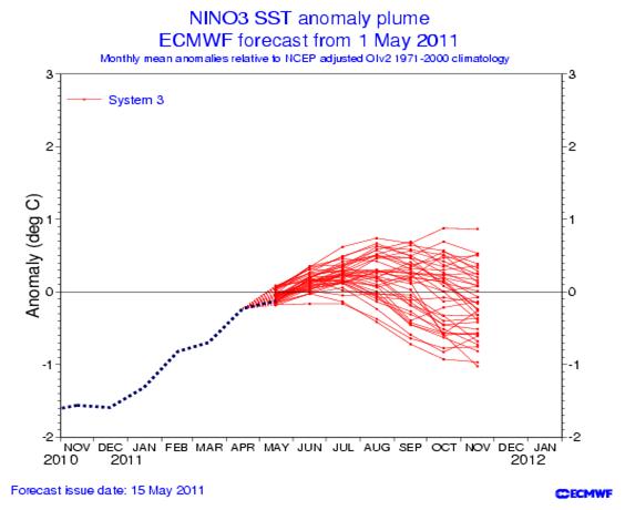 Sin embargo, las previsiones de los diferentes modelos advierte una leve tendencia hacia valores positivos durante este trimestre, pero luego dirigiéndose a valores negativos a partir de Agosto. Hacia el final del período de pronóstico, algunos resultados muestran valores negativos significativos.