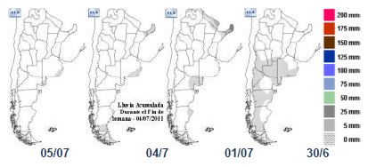 Durante la semana no se presentaron precipitaciones en la región. El predominio de un centro de alta presión en la zona central del país generó condiciones estables sobre GEA, lo que inhibió el desarrollo de precipitaciones, inclusive, fue escasa la nubosidad a lo largo de todo el período, por lo que se observaron altos valores de radiación solar. En cuanto a las temperaturas, las mediciones fueron notoriamente inferiores a las que se venían registrando. Los valores mínimos fueron muy bajos, con heladas muy importantes en toda la región y durante toda la semana. El valor más extremo se registró en Canals, provincia de córdoba, donde el termómetro alcanzó la marca de 8,5°C bajo cero.