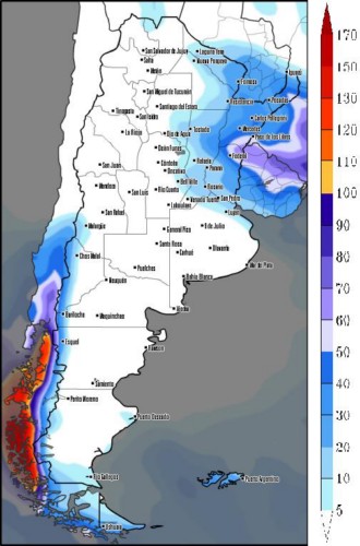 No se esperan precipitaciones significativas en toda la región, a lo largo de este período. Sólo sobre la provincia de Salta, en su zona central, podrían llegar a registrarse algunas precipitaciones hacia mediados del período, pero en forma muy débil y aislada, con acumulados inferiores a los 5mm.