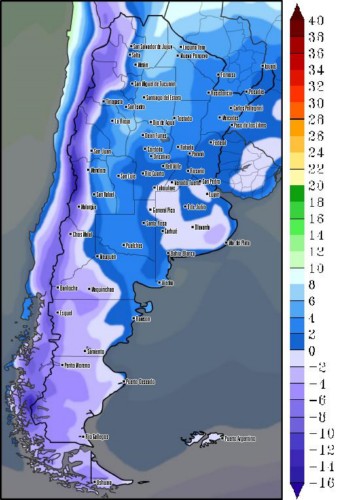 En cuanto a las marcas térmicas mínimas, se observarán algunas heladas aisladas durante los primeros días del período, especialmente durante el miércoles y jueves, luego, con la rotación del viento al sector norte, se espera un significativo incremento de las marcas térmicas. Luego, hacia el final del período, nuevamente se prevé el ingreso de una masa de aire frío y seco que favorecerá nuevamente el registro de heladas de moderada intensidad.
