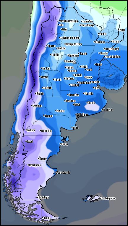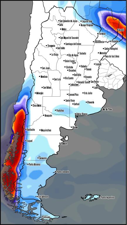 Sobre la región se observarán algunas precipitaciones débiles y aisladas, especialmente durante la primera mitad del período, con el avance de un sistema frontal frío. Las precipitaciones más importantes se registrarían sobre la región cordillerana de toda la Patagonia en forma de nevadas.
