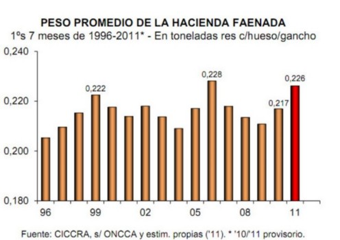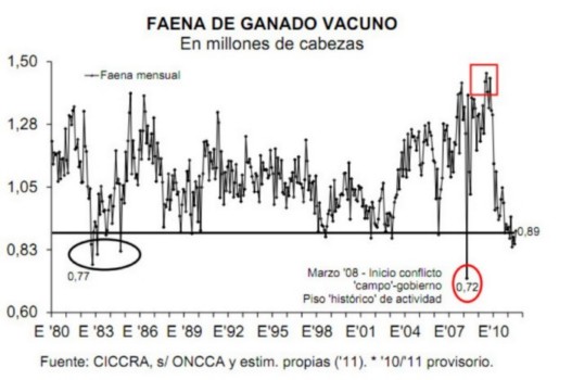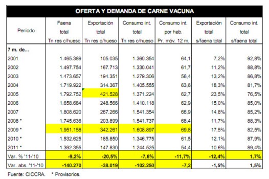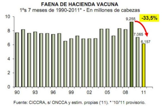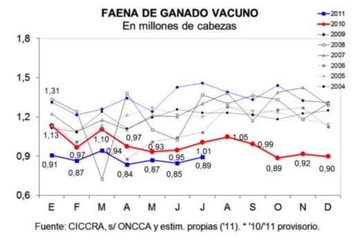 En el acumulado de los primeros siete meses del año la faena vacuna habría alcanzado un nivel de 6,157 millones de cabezas. Con relación al mismo período de 2010 habría acumulado una disminución de 12,8% (-907,8 mil cabezas) y al contrastar con el máximo de enero-julio de 2009, la caída se habría elevado hasta 33,5% (-3,10 millones de cabezas). Y es importante resaltar que fueron los peores primeros siete meses de los últimos veintidós años.