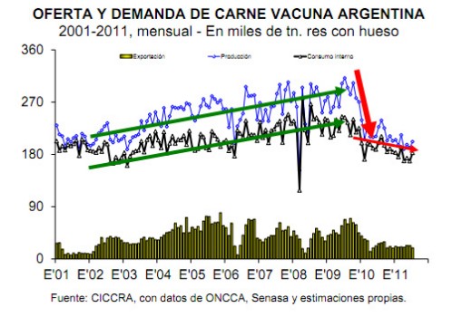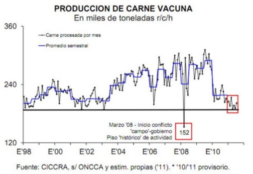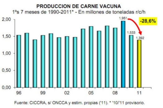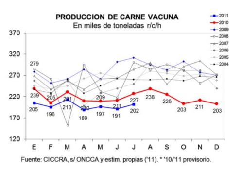 La producción de carne vacuna totalizó 1,392 millones de tn r/c/h en enero-julio de 2011. Esto implicó una caída de la oferta de carne vacuna de alrededor de 140,27 mil tn r/c/h con respecto al mismo período del año pasado y una baja de hasta 558,8 mil tn r/c/hcon relación a enero-julio de 2009.