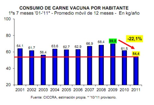 En lo que respecta al promedio móvil de los últimos doce meses del consumo por habitante de carne vacuna, en julio marcó un nivel de 54,4 kilogramos/habitante/año, guarismo que resultó 11,7% inferior al de julio de 2010 y 22,1% menor al de julio de 2009(récord de la primera década del siglo XXI).
