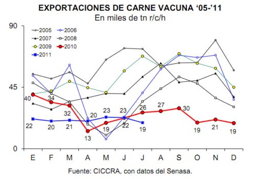La producción de carne vacuna totalizó 202 mil toneladas res con hueso (tn r/c/h) en julio de 2011, guarismo que resultó 11,2% inferior al de julio de 2010.