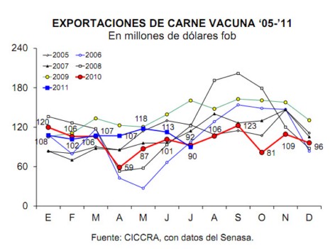 En julio la facturación por exportaciones de carne vacuna llegó a 89,9 millones de dólares fob (-2,7% anual) y en los primeros siete meses del año alcanzó un nivel de 743,5millones de dólares fob. En términos interanuales, este último valor fue 10,7% anual superior y con respecto a enero-julio de 2009 fue 16,8% inferior.