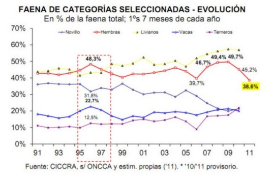 Sólo en enero-julio de 2006, un período anormal debido al primer cierre de los mercados externos por parte del propio gobierno argentino, se registró también una participación de las hembras en la faena total inferior a 40% (pero fue de 39,7%).