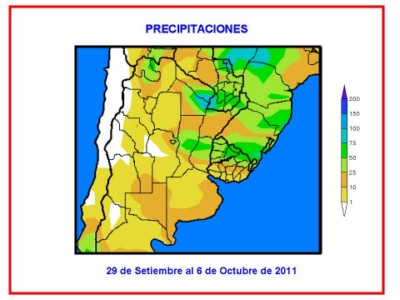 Perspectiva agroclimática nacional del 29 de setiembre al 6 de octubre de 2011: las lluvias primaverales comienzan con valores desparejos y no llevan alivio efectivo al oeste del área agrícola nacional