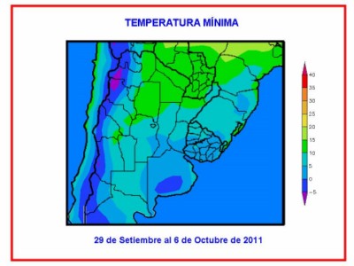 El resto del área agrícola nacional observará precipitaciones escasas a nulas (menos de 10 mm). A medida que se produzca el paso del frente, los vientos desde el sector sur, haciendo descender la temperatura en la mayor parte del área agrícola nacional, con riesgo del heladas en el sur y parte del centro de la misma. Posteriormente, los vientos rotarán al sector norte haciendo ascender la temperatura por encima de lo normal para la época.