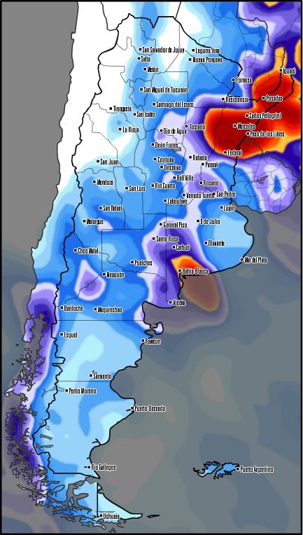 Los acumulados previstos serán importantes tanto en la provincia de La Pampa como en la provincia de Buenos Aires, pero especialmente sobre el sudoeste de la provincia de Buenos Aires. A partir del lunes, las condiciones irán cambiando en gran parte de la región, en especial sobre el oeste de la zona, mientras que en la franja costera de la provincia de Buenos Aires todavía pueden registrarse algunas precipitaciones aisladas, especialmente en horas de la tarde.