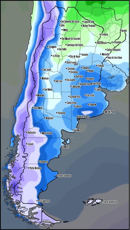 Luego, posterior al pasaje de la perturbación antes mencionada, se dará un significativo descenso de temperatura, con los registros más bajos sobre el sur de la provincia de San Luis, que estarán en torno a los 9-11° C.
