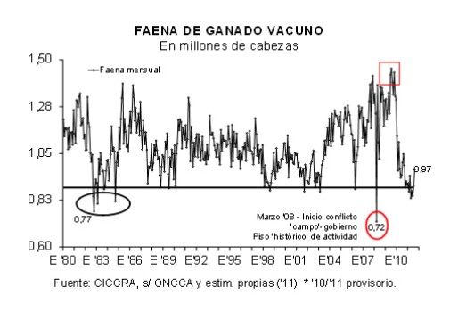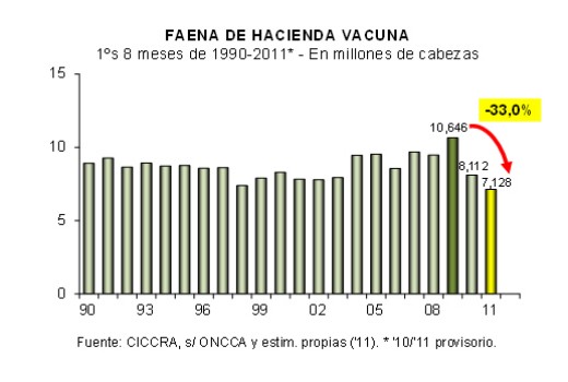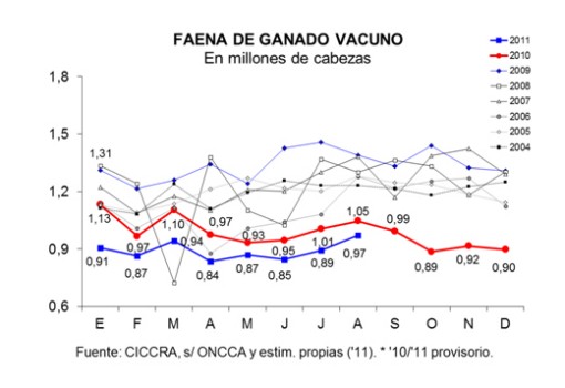 En el acumulado de los primeros ocho meses del año la faena vacuna habría alcanzado un nivel de 7,128 millones de cabezas y con respecto a enero-agosto del año pasado habría registrado una disminución de 12,1% (-984,0 mil cabezas). En tanto, si contrastamos con el máximo de enero-agosto de 2009, la caída se habría elevado hasta 33,0% (se habrían faenado 3,52 millones de cabezas menos). Y conforme avanza el año y se mantiene el bajo nivel de actividad, se sostiene el hecho de que a nivel sectorial, 2011 es el peor año de los últimos veintidós.
