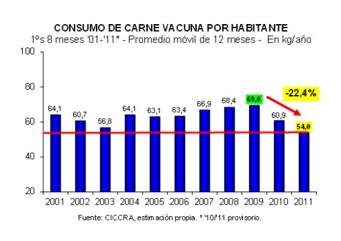 Las contracciones de faena y producción de carne impactaron tanto sobre el consumo interno y como en las exportaciones. El consumo interno cayó sólo 7,5% anual, esto tradujo al promedio móvil de los últimos doce meses del consumo por habitante de carne vacuna, alcanzó en agosto un nivel de 54,0 kilogramos/habitante/año, guarismo que resultó 11,4% inferior al de un año atrás y 22,4% menor al de agosto de 2009.