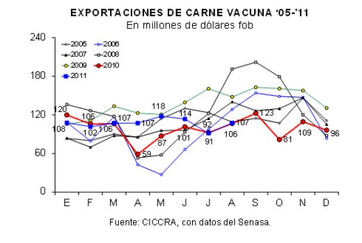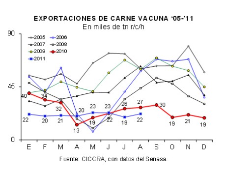El Senasa certificó exportaciones de carne vacuna por 14.097 tn peso producto (tn pp) en agosto de 2011, guarismo que retornó casi al nivel promedio del bimestre mayo-junio. Y en los primeros ocho meses del año se completaron embarques por un total de 109.533 tn pp de carne vacuna, que resultaron 18,9% inferiores a los de enero-agosto de 2010 (y 58,3% menores a los de igual período de 2009).