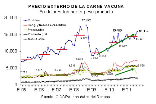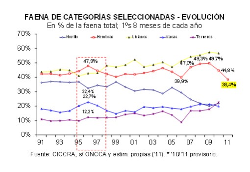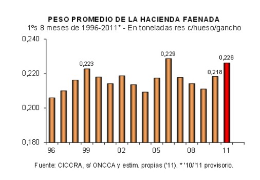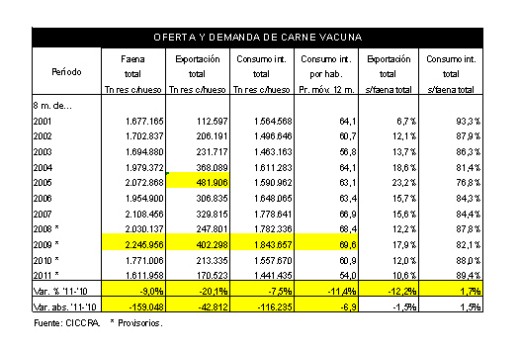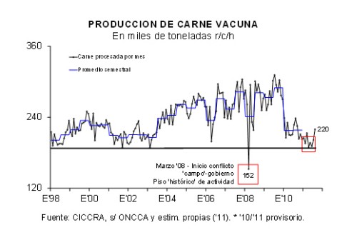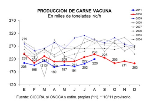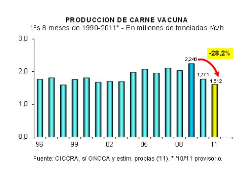 En los primeros ocho meses de 2011 la producción de carne vacuna se ubicó alrededor de 1,612 millones de tn r/c/h. En consecuencia, la disponibilidad de carne vacuna para el mercado interno y externo experimentó una baja de aproximadamente 160 mil tn r/c/h con respecto a enero-agosto de 2010. En relación a enero-agosto de 2009, la reducción de la oferta habría llegado a 634 mil tn r/c/h.