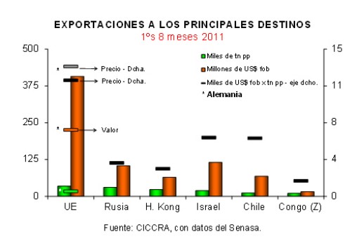 1. Según volúmenes, los más importantes fueron: Rusia, Hong Kong, Israel, Alemania, Chile, Congo (ex Zaire), Brasil, Holanda, EE.UU. e Italia. En total adquirieron 78,7% del volumen exportado por nuestro país. La Unión Europea (UE) como región representó 19,2% del total. En comparación a un año atrás aumentó la concentración de los embarques en los principales diez destinos, ya que en los primeros ocho meses de 2010 habían comprendido 77,1% del total.