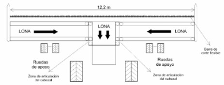 Figura 2. Esquema de un cabezal Draper, representando la disposición de las lonas de alimentación con respecto a la barra y las ruedas de apoyo. Fuente: INTA PRECOP.