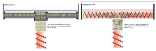 Figura 3. Esquema comparativo de un cabezal draper y un cabezal tradicional con sinfín, representando la disposición de la capa de material que es conducido hacia el embocador. Fuente: INTA PRECOP.