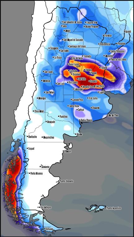 Luego, las mismas se intensificarían con la llegada del sistema frontal, desarrollando chaparrones y tormentas fuertes. Los acumulados más importantes se estarían concentrando sobre el centro y sur de Córdoba y el sur de Santa Fe durante el día sábado y domingo.