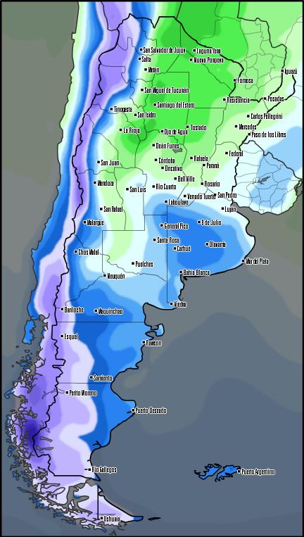 Luego las condiciones cambian significativamente, ya que ingresará un centro de alta presión acompañado de una masa de aire frío y seco que generará un importante descenso de temperatura y una disminución de la cantidad de humedad en las capas bajas de la atmósfera por lo que se prevé la estabilización de las condiciones. Por lo tanto, durante parte del lunes y el martes se prevé tiempo con escasa nubosidad, viento prevaleciente del sector sur, y bajos registros térmicos.