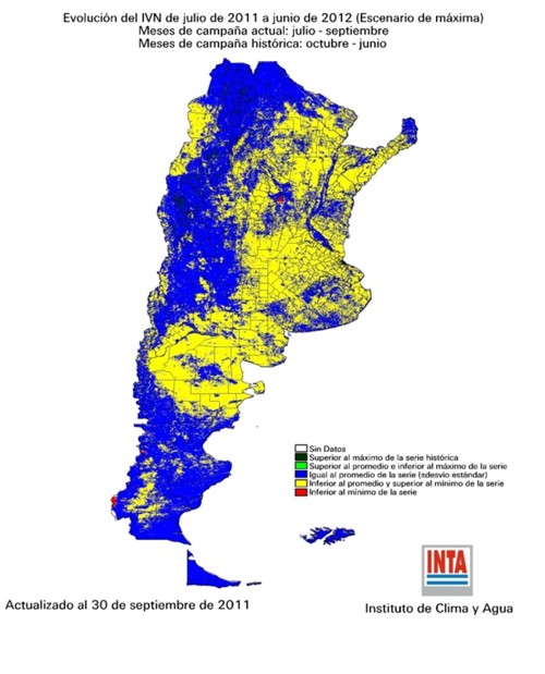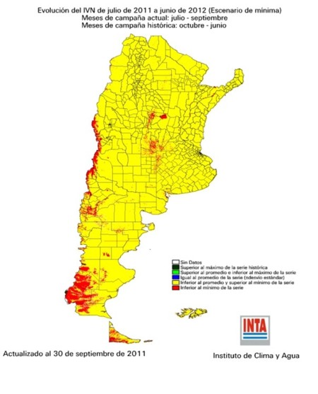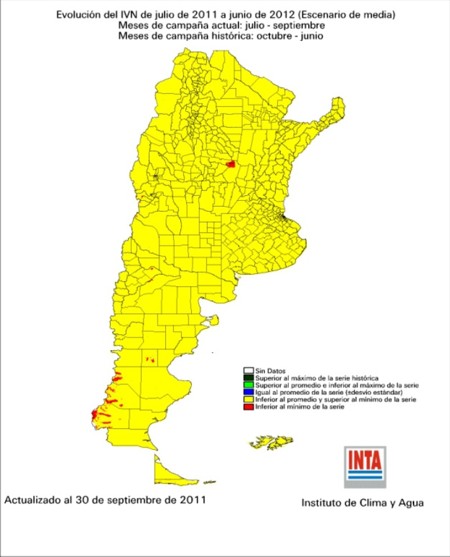 El último reporte del Instituto de Clima y Agua del INTA Castelar en cuanto al escenario probable del índice verde hasta Junio del 2012 marca lo siguiente para tres escenarios: