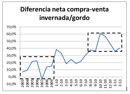 Como se verá pasamos de una relación de compra venta ternero/gordo de 0-20% del 2003 al 2009 a una relación del último año de entre 35 y 50%.