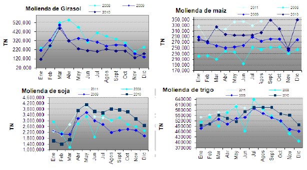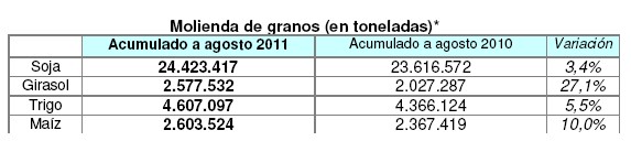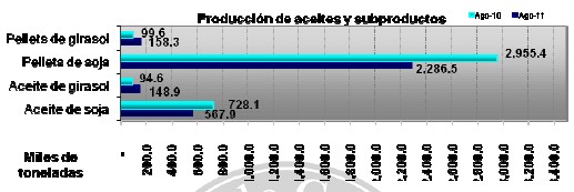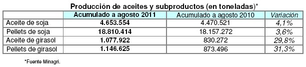 La producción de Aceites y subproductos, acumulados a agosto presentó las siguientes variaciones con respecto al mismo período del año anterior: para los subproductos de la soja (aceites 4,1%, pellets 3,6%) y los de girasol (aceites 29,8%, pellets 31,3%).