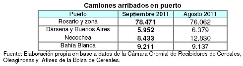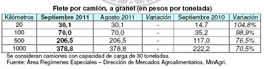 Los fletes por Camión para septiembre de 2011, presentaron las siguientes variaciones con respecto al mismo mes del año anterior: 20 km +104,8%, 100 km +98,9%, 500 km +76,5%, 1000 km +70,5%.