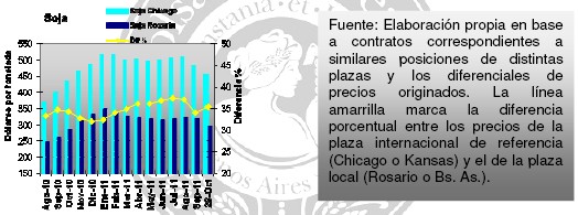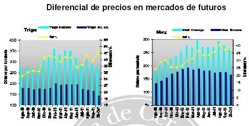 Los diferenciales de precios entre similares posiciones de distintas plazas de los Mercados de Futuros son los siguientes para el mes de septiembre: para el trigo (42,3%), para la soja (34,0%) y para el maíz (37,3%).