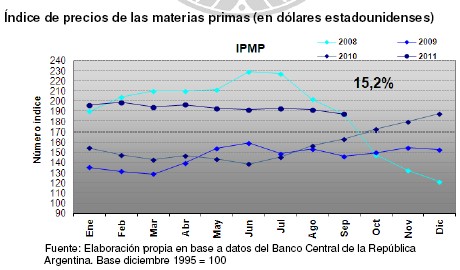 El Índice de Precios de Materias Primas de septiembre se ubicó en un valor de 187,3. En términos interanuales la variación es de 14,7%, e intermensualmente se observa una baja del 2,4%.