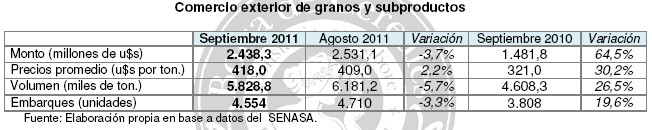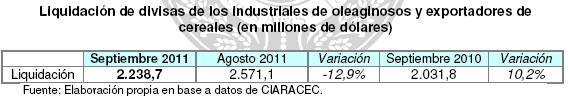 Las ventas externas de granos y subproductos en septiembre presentaron las siguientes variaciones con respecto al mes anterior: -3,7% para los montos, 2,2% para los precios, -5,7% para los volúmenes y -3,3% para los embarques. La liquidación de divisas presentó en septiembre una variación de -12,9% con respecto al mes anterior. Respecto al mismo mes del año pasado la variación fue de 10,2%.