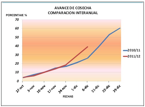 A la fecha se lleva recogida el 39,5% del área apta a cosecha, 10,3 puntos porcentuales por encima de la semana pasada y 13,1 puntos superior en comparación a similar fecha de la última zafra. Se trillaron algo mas de 1,7 millones de hectáreas que aportaron 4.000.000 Tn de grano promediando así un rendimiento a nivel país de 2.300kg/ha. Esta productividad unitaria se ira incrementando a medida que avance la trilla en los polos productivos trigueros del centro sur nacional.