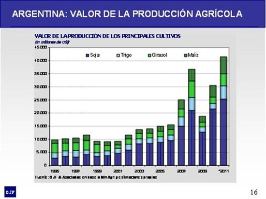 Pero lo más extraordinario es que también se dio para Argentina un incremento muy grande de precios: en la época de De la Rúa, la soja valía 160 dólares/ton y en 2011 se vendió a 530 dólares/ton, o sea, con un aumento de 3,3 veces.