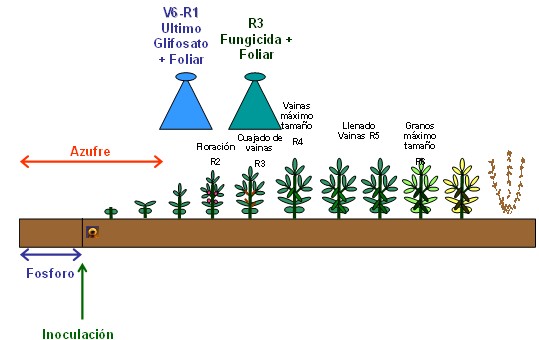 La nutrición en soja integra la provisión de nitrógeno (N) por fijación biológica (FBN), y el aporte de fósforo (P) y azufre (S) agregados al suelo, por lo general al momento de la siembra. En los últimos años, se ha experimentado la aspersión de micronutrientes, formas fácilmente asimilables de macronutrientes y moléculas orgánicas por vía foliar, para estimular el crecimiento de las plantas y complementar aquella estrategia de base, con la finalidad de obtener mayores rendimientos o una mejor calidad del producto cosechado. Por lo general, los fertilizantes foliares se aplican de manera conjunta con agroquímicos defensivos para la protección del cultivo, siempre que las formulaciones sean compatibles (Figura 1).