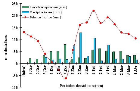 En la Figura 2 se presentan las precipitaciones determinadas en el sitio experimental y la evapotranspiración del cultivo, así como el balance hídrico decádico. Aun soportando un breve período de estrés inicial, las precipitaciones fueron abundantes alcanzando en el ciclo de cultivo a 581,6 mm. Esto permitió almacenar incipientes reservas durante enero, lo que posibilitó que el cultivo no tuviera déficit de allí en adelante.