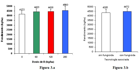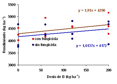La fertilización con B incrementó el vigor y disminuyó la altura de plantas con síntomas (%) de mancha marrón (Septoria glycines), probablemente a causa de un mayor crecimiento de los tratamientos fertilizados. En cambio, no se observó una tendencia clara para los valores de Spad, no se modificó la cobertura en R3 ni el tipo de infección de mancha ojo de rana (Cercospora sojina). No se determinaron efectos significativos sobre los rendimientos para fertilización con B (P=0,32), fungicidas (P=0,32), ni su interacción (P=0,97, CV=8,0%) (Tabla 5). No obstante, la aplicación de B permitió obtener incrementos en un rango de 297,1 a 360,6 kg ha-1 sin fungicida, y de 204,1 a 415,0 con aplicación del mismo (Tabla 5). La respuesta a B y fungicida fue aditiva: La diferencia por fungicida no se modificó para ninguna de las dosis de B evaluadas, y la pendiente de respuesta a B no difirió entre tratamientos con y sin fungicidas (P>0,10) (Figura 4). Esto permite promediar la respuesta a B para ambas estrategias de uso de fungicidas (Figura 3.a) y la respuesta a fungicida, como media de cuatro dosis de B (Figura 3.b).